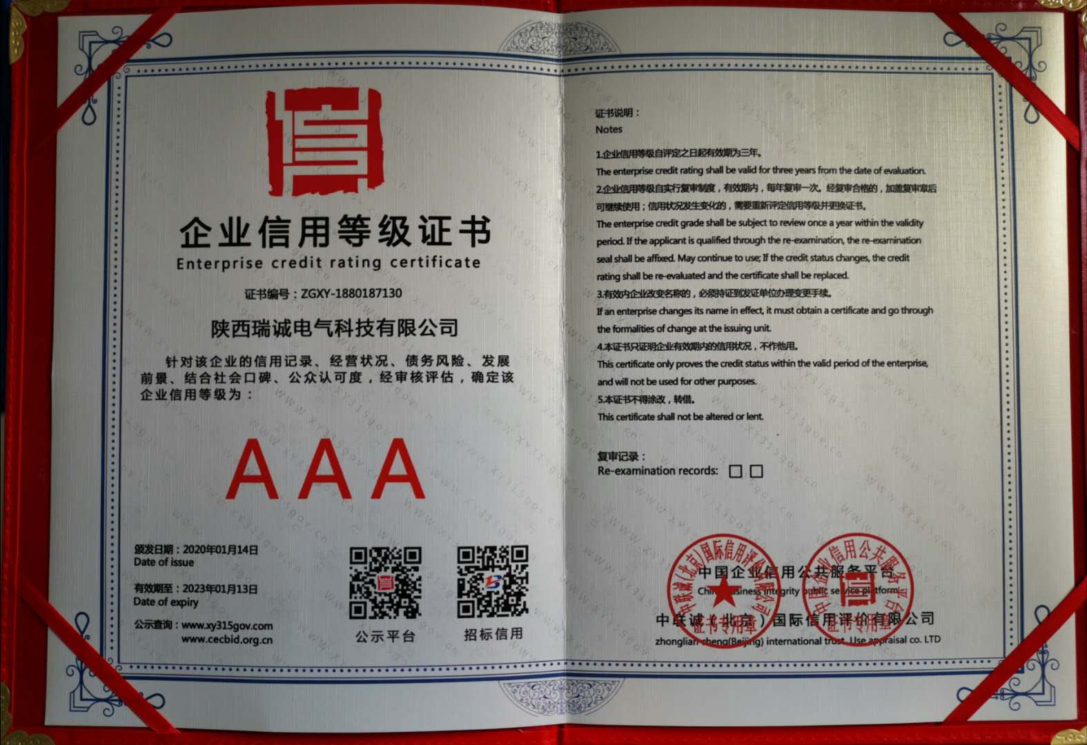 熱烈祝賀(he)我公司榮(róng)獲《AAA級企業(yè)信用等級(ji)證書》。瑞電(dian)科技公司(si)被評為“AAA信(xìn)用企業”将(jiang)成為中國(guó)企業信用(yong)誠信經營(ying)